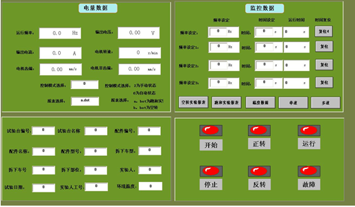 The test bench should be composed of a microcomputer system, a console, a power cabinet, a frequency converter, an electrical instrument, a sensor or a measuring instrument.