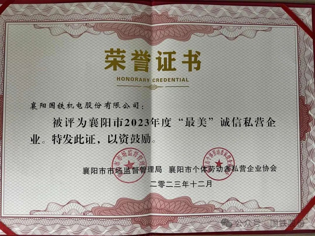 【喜報(bào)】國鐵機(jī)電獲“襄陽市2023年度‘最美’誠信私營企業(yè)”榮譽(yù)